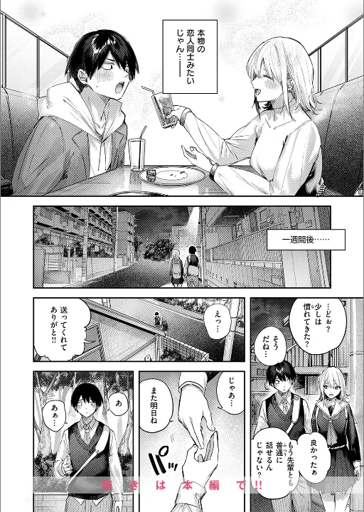 皆の憧れ・生徒会長の朝日奈(あさひな)先輩に告白するため、人懐っこくて周りから好かれている幼馴染の流歌(るか)に相談した俺。女のコと付き合ったことはおろか、ろくに喋ったこともない根暗な俺に、流歌は先輩と付き合えるように訓練してあげると言い出した。流歌に手を引かれるまま、放課後デートしたり、手をつないでみたり……流歌の考えていることはわからないけど、本物の恋人同士のようにやれていると思う。そんなある日、家に誰もいないから上がっていかないかと提案してきた流歌。流歌の部屋で2人きり。これってもしかして誘われてる!? なんてドキドキしていたら……。「…ねーいつまで待たせるの?」《ごっこ》じゃない、ホンモノのラブラブエッチが始まる――