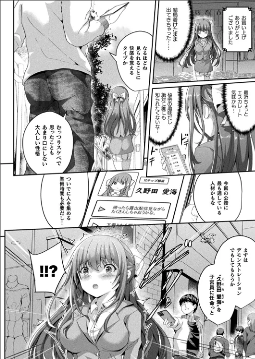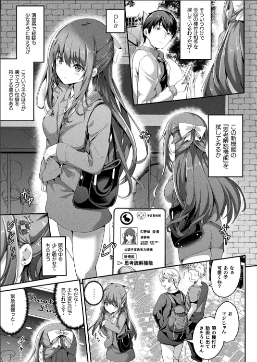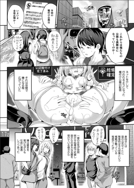 ハイテク孕ませ少子化対策第4話!男からの視線に喜ぶムッツリOLを街中で公開種付け!?合法的に異性に種付けを行う「公認種付け士」の噂は次第に広がっていた。そんな中、公認種付け士である恭太は街中のとあるOL、久野田愛海に目をつけ、アプリの『思考解読機能』を使って彼女が淫猥な下着を身につけて興奮するムッツリであることを突き止める。そして恭太はそんな愛海を子宮員に任命して肉体を操って街中で自慰をさせるに飽き足らず、群衆の中での種付けを始めるのであった……。